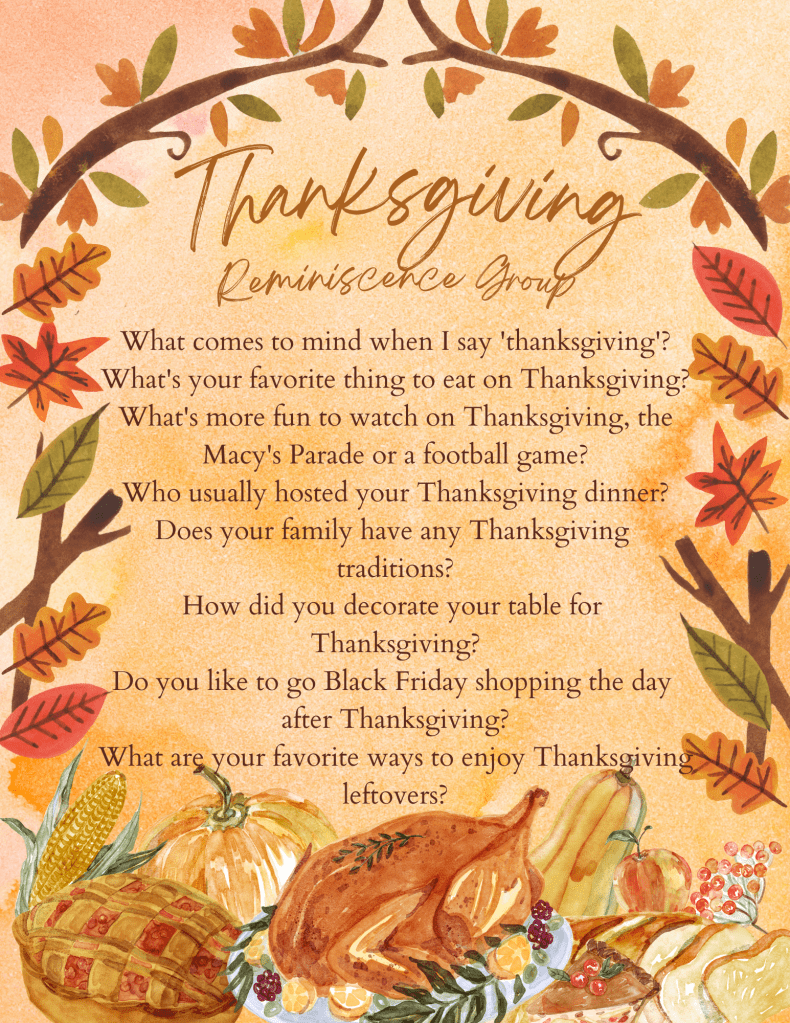 Thanksgiving is an iconic American holiday that many of our Residents have celebrated for their entire lives. It should of course be included on The Memory Unit – and reminiscence groups are one of the best ways to integrate any holiday into a therapeutic activity.