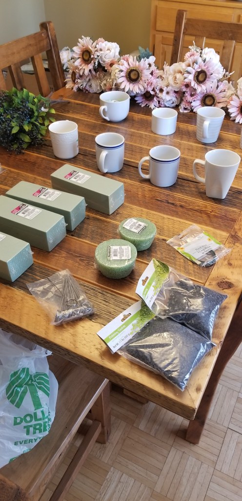This is one of my favorites. You can get everything you need from the Dollar (*25*) Store. Vases, floral foam, and faux florals and greenery. These could be made to spruce up the unit or to give as a gift, and are always so beautiful when they’re complete (no matter how much practice you have in floral arrangements).
