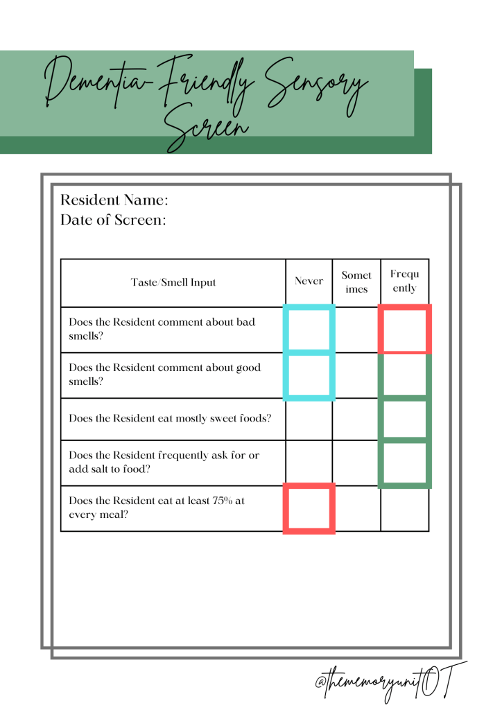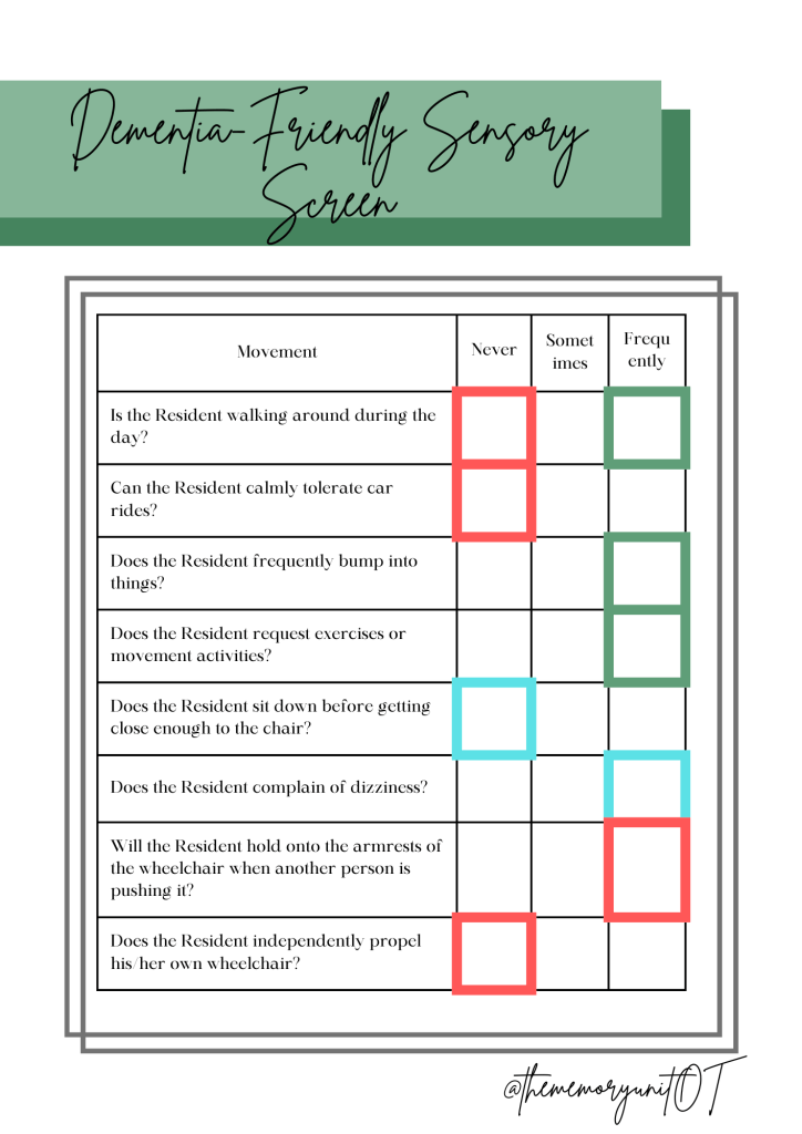 In general Occupational Therapy Practice, I’m a huge proponent of the Sensory Profile. I used it significantly during one of my Level II placements, and found it to be highly effective in identifying therapeutic strategies to improve sensory regulation. However, due to the nature and detail of the questions, it’s not the ideal assessment for dementia care. There’s a lot of introspection and short-term memory that’s required, which can be overwhelming for individual’s living with dementia.