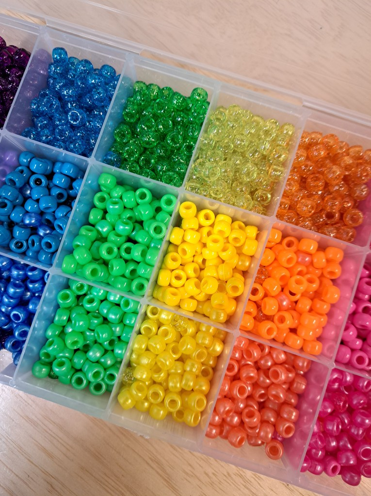 If I can find a bead organizer, I’ll ask the Resident to sort the beads into the corresponding color as they retrieve each bead from the putty.