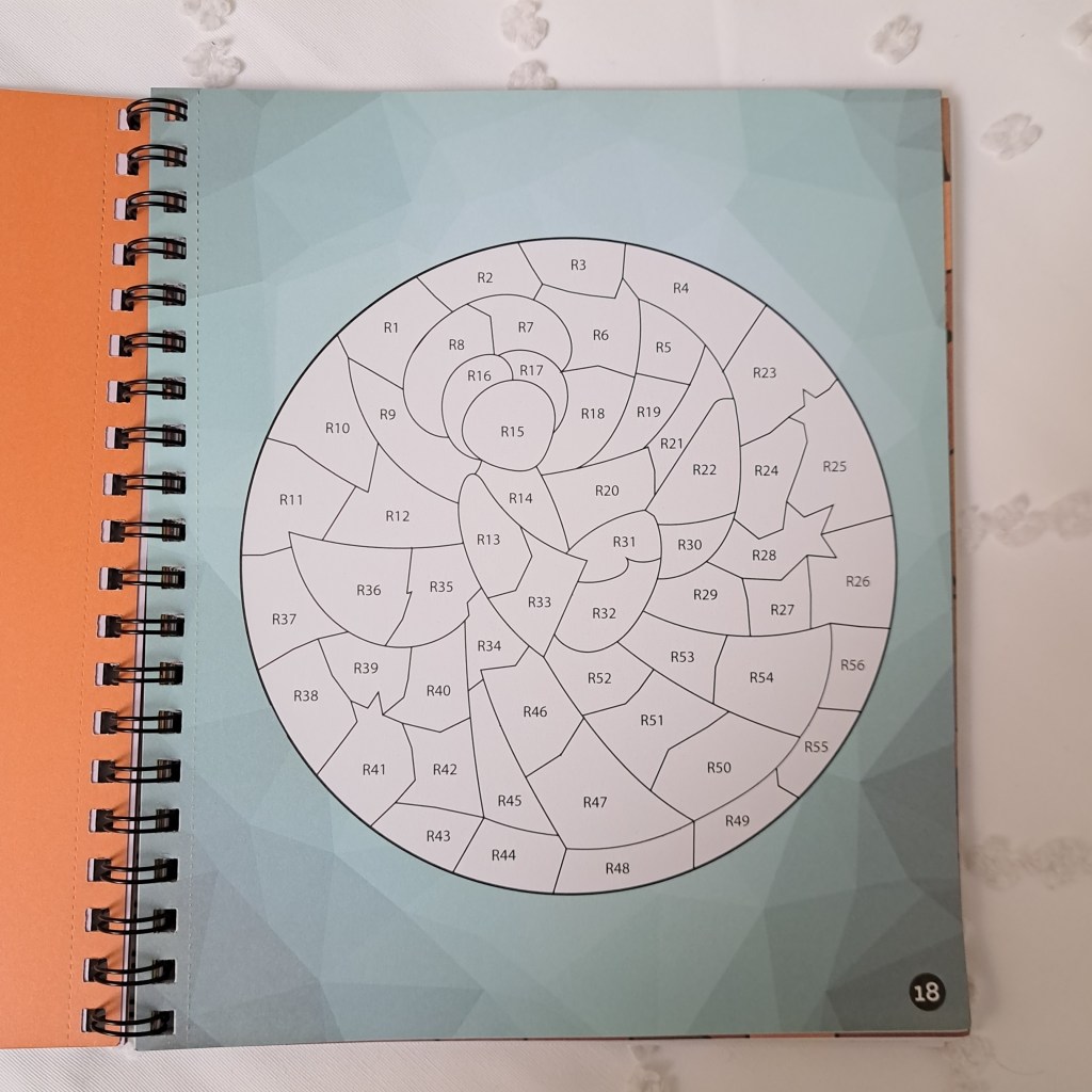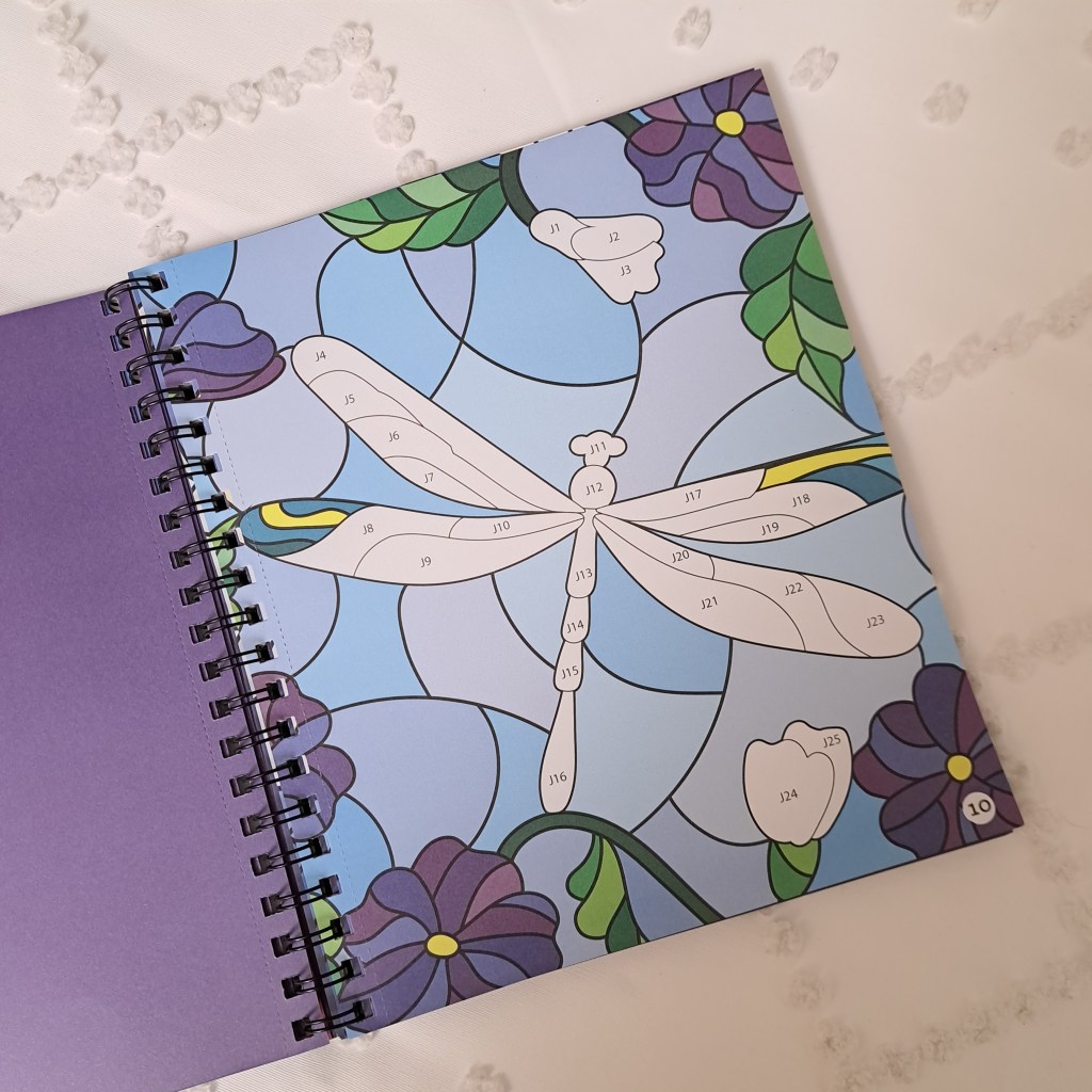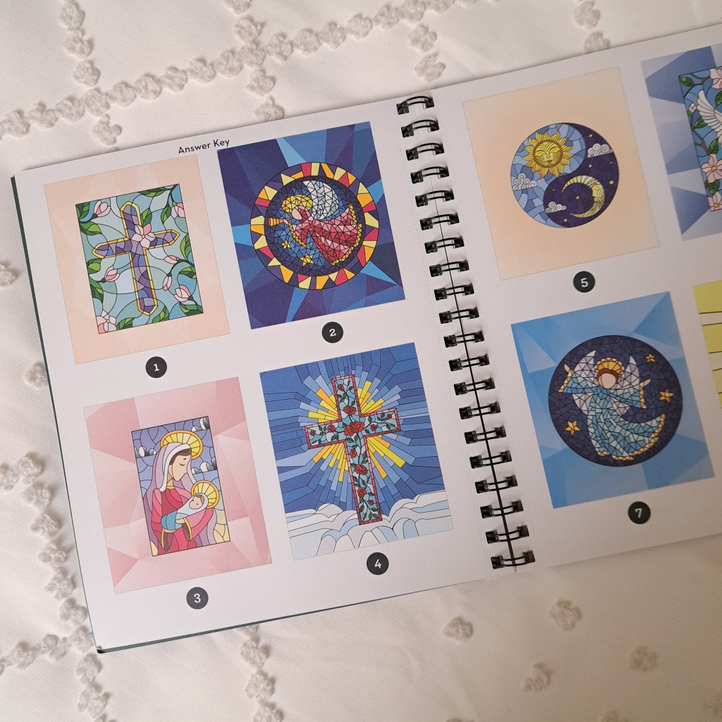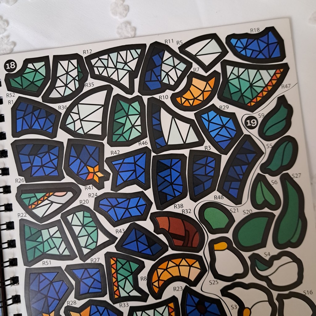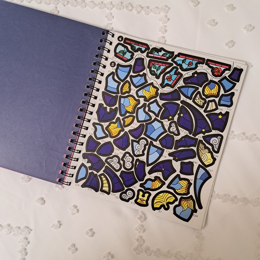 This is a spiral-bound book of 28 different Sticker-by-Number illustrations. They all are designed to look like stained glass, and there’s a decent variety of illustrations throughout. The first 28 pages of the book consist of single-sided art pages, each numbered. There is then an index showing completed versions of each art page, followed by single-sided sticker pages.